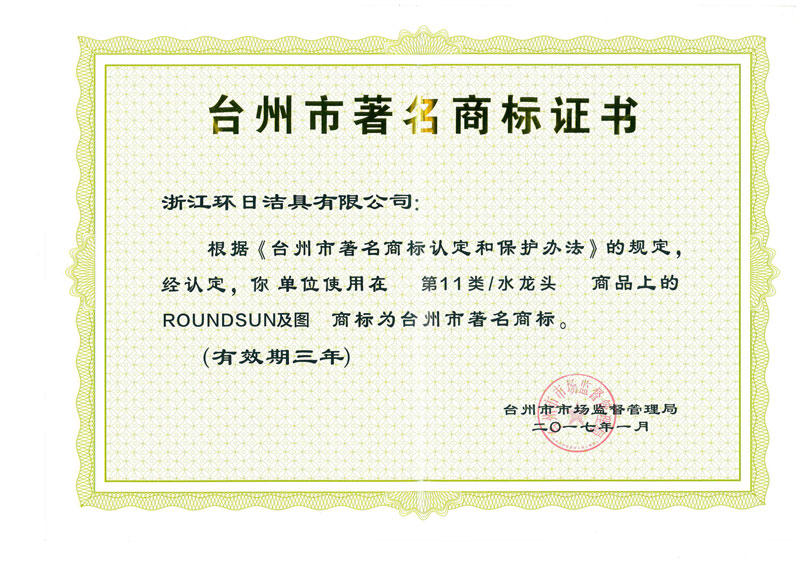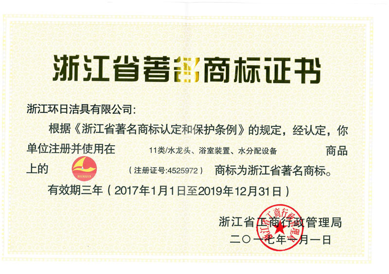 目前公司年開發(fā)新產品(ODM)150套,自營品牌年開發(fā)(OBM)160多套,貼牌加工年開發(fā)(OEM)200多套,申請獲得中國國家知識產權局產品外觀設計專利160項、實用型專利16項。先后榮獲臺州市進出口行為規(guī)范企業(yè)、臺州市著名商標、臺州市名牌產品、省工商信用企業(yè)A級、省水暖閥門誠心企業(yè)、省重信用守合同AA級、省高新技術企業(yè)、中國衛(wèi)浴知名品牌、中國衛(wèi)浴綠色水龍頭等,已經通過了ISO9001認證、CE認證、以及ACS產品認證。2010年通過英國WRAS認證,2011年通過ISO14001環(huán)境體系認證,同年通過LGA認證。環(huán)日緊跟時代潮流,融合傳統與現代元素,帶來古典美與現代美的雙重享受。